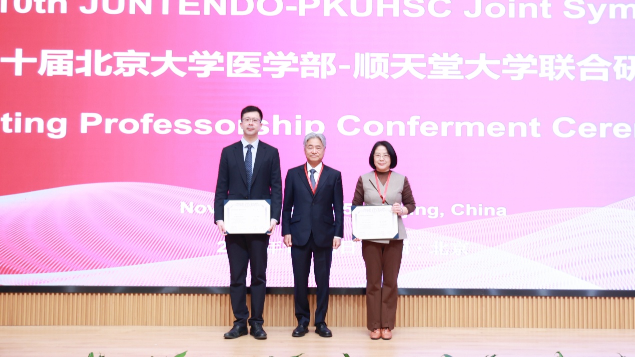 接下来进行客座教授聘任仪式。首先顺天堂大学校长代田浩之向乔杰授予顺天堂大学“荣誉客座教授”证书,并向王嘉东和郭莉萍授予顺天堂大学“客座教授”证书。随后,我校常务副校长乔杰向尼勇萨巴·弗朗索瓦和内藤俊夫授予北京大学医学部“客座教授”证书。