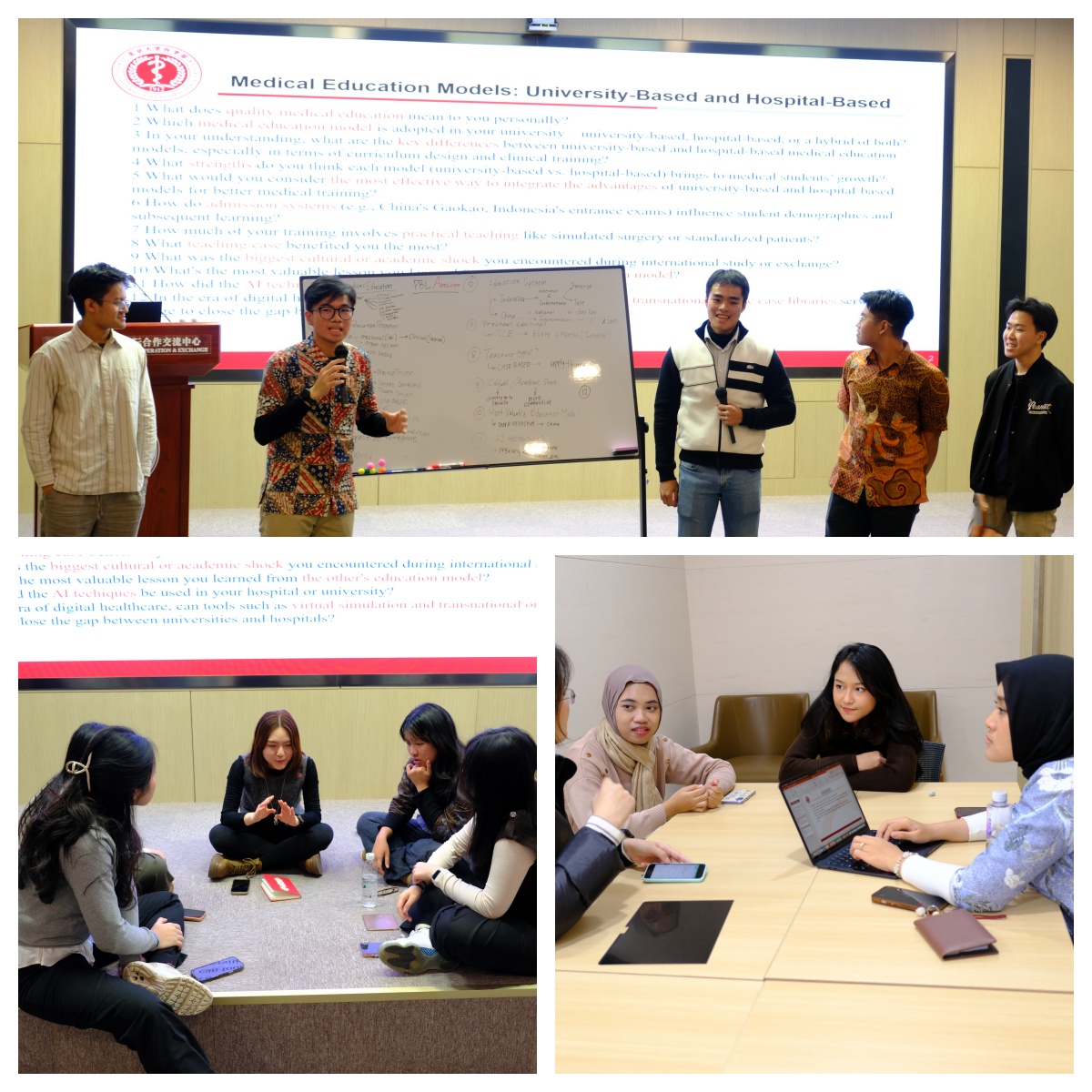 在为期两天的学习交流后,同学们进行了主题为 “医学教育模式:大学本位 vs 医院本位” 的小组讨论。中印尼学生混合组成6个小组,围绕“优质医学教育的内涵”、“本校教育模式特点”、“两种模式的差异与优势”、 “AI对医学教育的影响”等问题展开了热烈探讨和精彩展示。大家结合自身学习经历各抒己见,坦诚分享了各自国家医学教育的实践经验与切身感悟,从不同视角呈现了对医学教育的思考。各小组的汇报环节亮点频出,跨文化的思想交锋与智慧碰撞贯穿始终,鲜活的观点、清晰的逻辑让现场掌声此起彼伏。